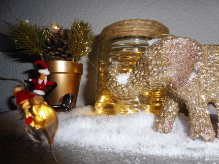 In another area, we are embracing the gold. From Venice, we bought a gorgeous Santa in the gondola, which we have paired with my gold elephant bauble, pinecones, faux snow and fairy lights. The addition of faux snow has been so perfect for it, Alex was not impressed when I brought home a tub of faux snow and thought it was a waste. But, once I sprinkled it on top and let it snow, he soon changed his tune! He’s now well on board with the faux snow and I’ve even caught him adding snow to it!